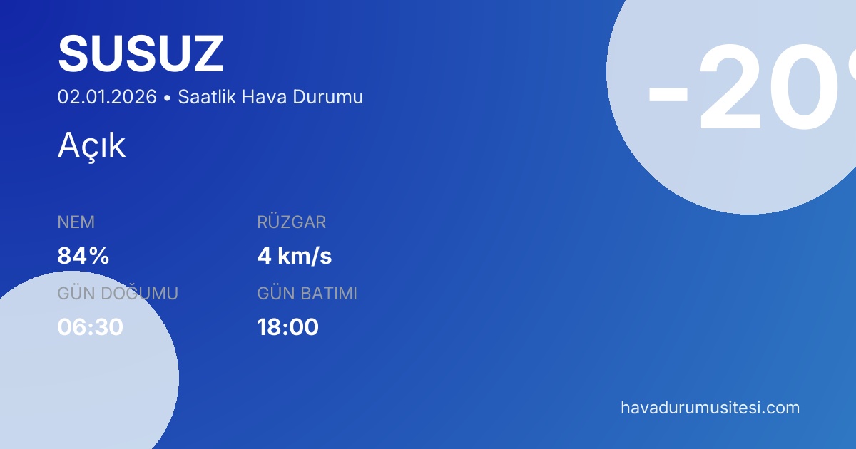 Şu anda Susuz'da sıcaklık -20°C, hava durumu Açık ve
