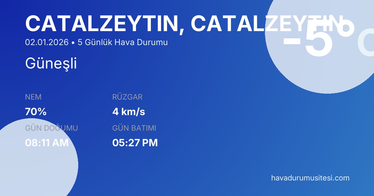 Çatalzeyti̇n için 5 günlük hava durumu tahminleri. Şu anda sıcaklık -5°C ve hava durumu Güneşli. Hissedilen sıcaklık -7°C. Nem oranı %70. Rüzgar hızı 4 km/s. Çatalzeyti̇n için güncel meteoroloji bilgileri, bugünkü hava durumu, yarınki tahmin ve 48 saatlik saatlik analiz sayfalarımızda detaylı bilgiler bulunmaktadır.