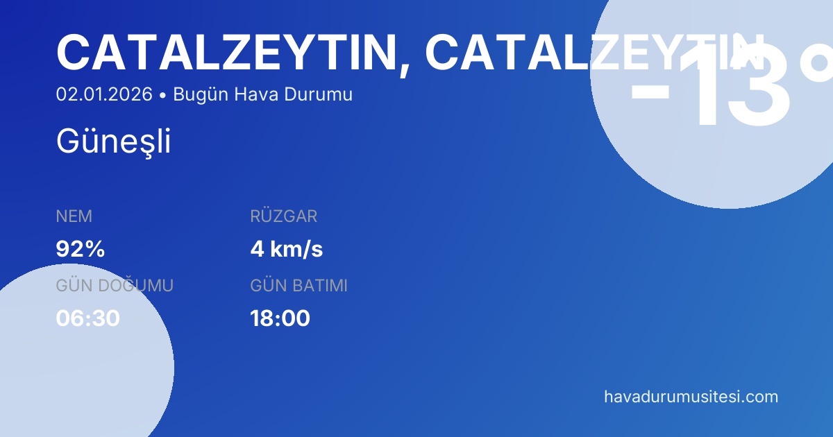 Çatalzeyti̇n bugün hava durumu tahminleri düzenli olarak güncellenmektedir. 7 günlük haftalık tahmin ve 30 günlük uzun vadeli tahmin sayfalarımız ile farklı zaman dilimleri için planlama yapabilirsiniz. Meteoroloji verileri güvenilir kaynaklardan alınmakta ve sürekli güncellenmektedir. Son güncelleme: 02.01.2026 09:55