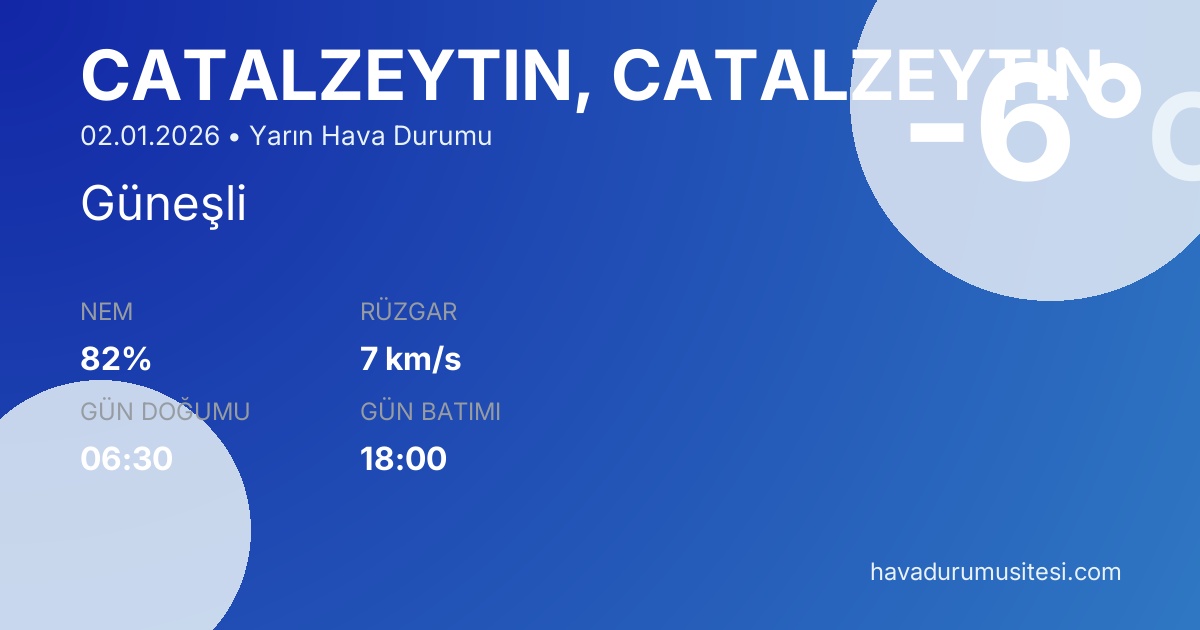 Çatalzeyti̇n yarın hava durumu tahminleri düzenli olarak güncellenmektedir. Meteoroloji verileri güvenilir kaynaklardan alınmakta ve sürekli güncellenmektedir. Son güncelleme: 02.01.2026 10:06