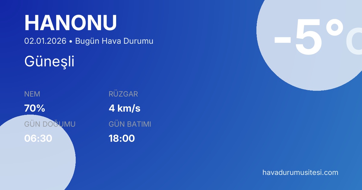 Hanönü için bugünün hava durumu bilgileri. Şu anda sıcaklık -5°C ve hava durumu Güneşli. Hissedilen sıcaklık -7°C. Nem oranı %70. Rüzgar hızı 4 km/s. Bugün sıcaklıkların -15°C ile -2°C arasında seyretmesi beklenmektedir. Hanönü için hava durumu, yarın, 5 günlük, 15 günlük ve saatlik tahmin sayfalarımızda detaylı bilgiler bulunmaktadır. Kastamonu ana sayfası ve Kastamonu 15 günlük tahmin sayfalarını da inceleyebilirsiniz.