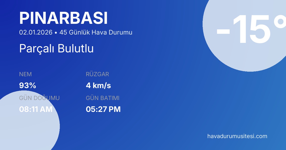 Pinarbaşi için 45 günlük detaylı hava durumu tahmini. Son güncelleme: 02.01.2026 07:53 | Veriler uluslararası meteoroloji standartlarına uygun olarak işlenmektedir.