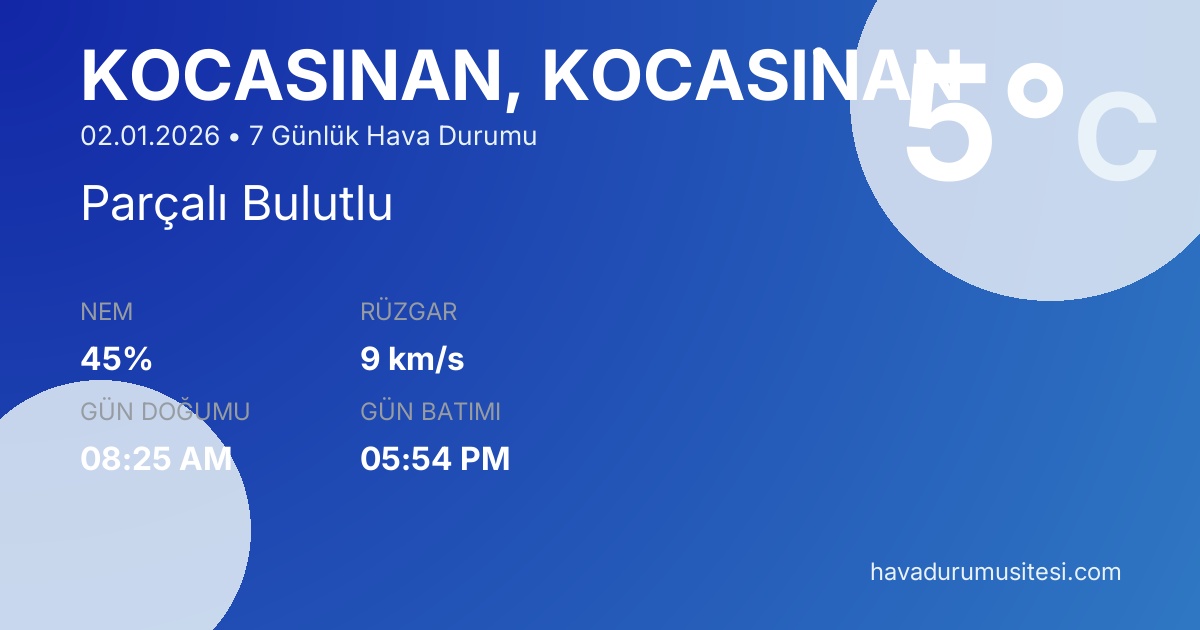Kocasi̇nan için 7 günlük hava durumu tahminleri. Şu anda sıcaklık 5°C ve hava durumu Parçalı Bulutlu. Hissedilen sıcaklık 3°C. Nem oranı %45. Rüzgar hızı 9 km/s. Kocasi̇nan için güncel meteoroloji bilgileri, bugünkü hava durumu, yarınki tahmin ve 48 saatlik saatlik analiz sayfalarımızda detaylı bilgiler bulunmaktadır.