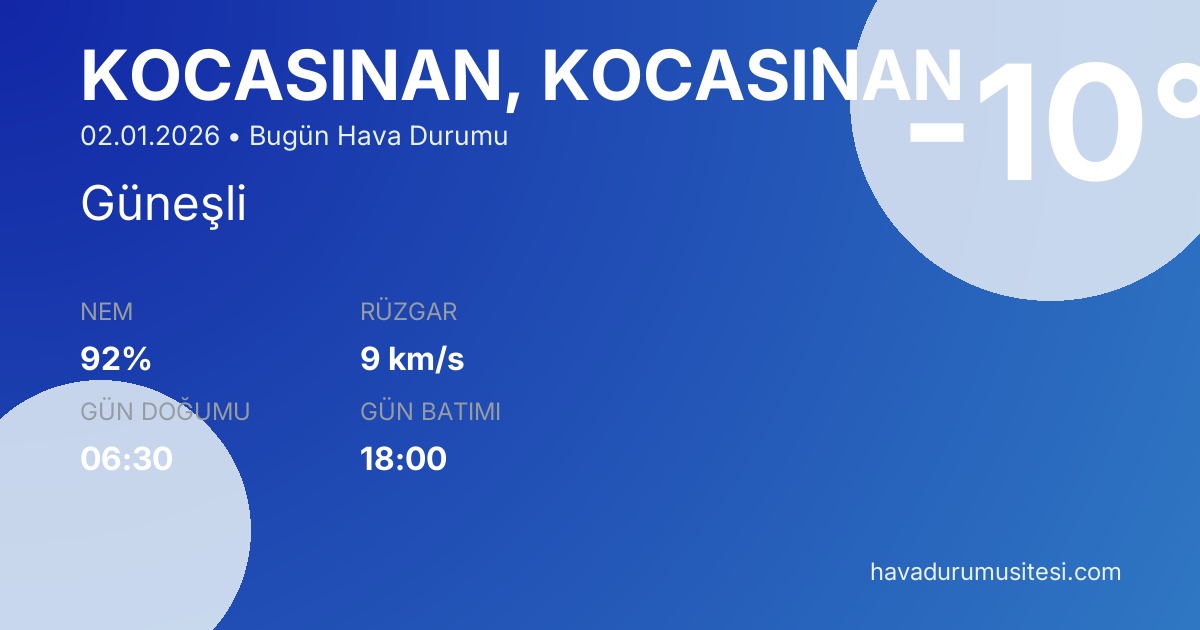 Kocasi̇nan bugün hava durumu tahminleri düzenli olarak güncellenmektedir. 7 günlük haftalık tahmin ve 30 günlük uzun vadeli tahmin sayfalarımız ile farklı zaman dilimleri için planlama yapabilirsiniz. Meteoroloji verileri güvenilir kaynaklardan alınmakta ve sürekli güncellenmektedir. Son güncelleme: 02.01.2026 09:44