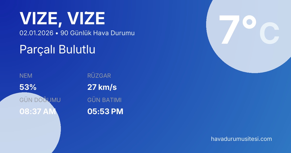 Vi̇ze için 90 günlük detaylı hava durumu tahmini. Son güncelleme: 02.01.2026 17:05 | Veriler uluslararası meteoroloji standartlarına uygun olarak işlenmektedir.