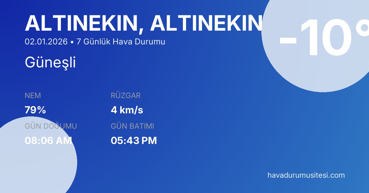 Altineki̇n için 7 günlük detaylı hava durumu tahmini. Son güncelleme: 02.01.2026 10:08 | Veriler uluslararası meteoroloji standartlarına uygun olarak işlenmektedir.