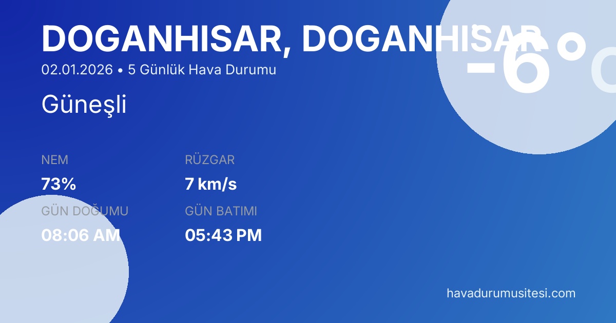 Doğanhi̇sar için 5 günlük detaylı hava durumu tahmini. Son güncelleme: 02.01.2026 11:54 | Veriler uluslararası meteoroloji standartlarına uygun olarak işlenmektedir.