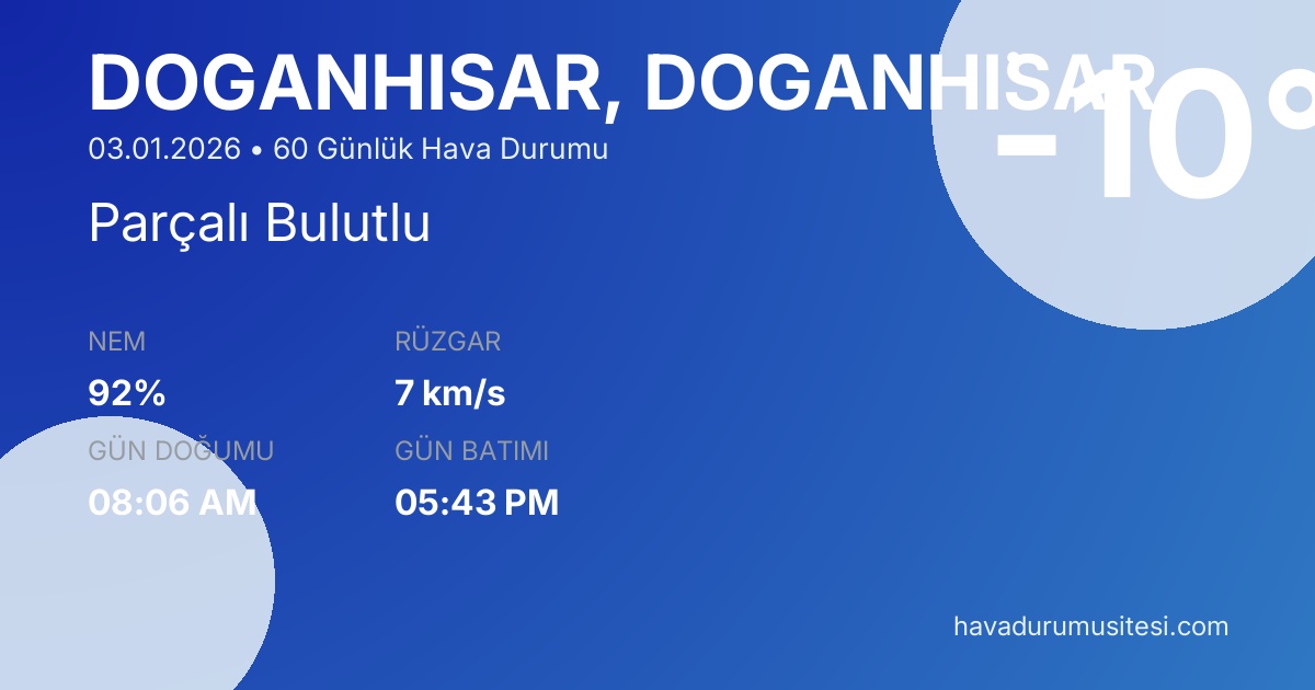 Doğanhi̇sar için 60 günlük detaylı hava durumu tahmini. Son güncelleme: 03.01.2026 05:25 | Veriler uluslararası meteoroloji standartlarına uygun olarak işlenmektedir.