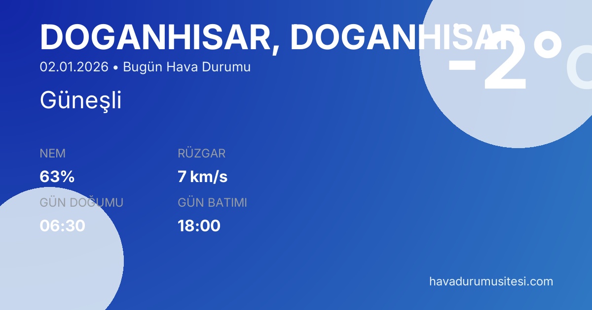 Doğanhi̇sar bugün hava durumu tahminleri düzenli olarak güncellenmektedir. 7 günlük haftalık tahmin ve 30 günlük uzun vadeli tahmin sayfalarımız ile farklı zaman dilimleri için planlama yapabilirsiniz. Meteoroloji verileri güvenilir kaynaklardan alınmakta ve sürekli güncellenmektedir. Son güncelleme: 02.01.2026 17:03