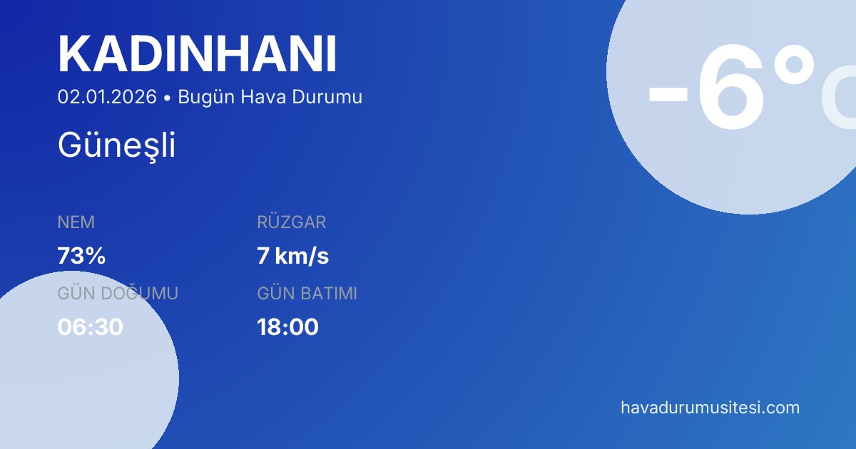 Kadinhani bugün hava durumu tahminleri düzenli olarak güncellenmektedir. 7 günlük haftalık tahmin ve 30 günlük uzun vadeli tahmin sayfalarımız ile farklı zaman dilimleri için planlama yapabilirsiniz. Meteoroloji verileri güvenilir kaynaklardan alınmakta ve sürekli güncellenmektedir. Son güncelleme: 02.01.2026 13:36
