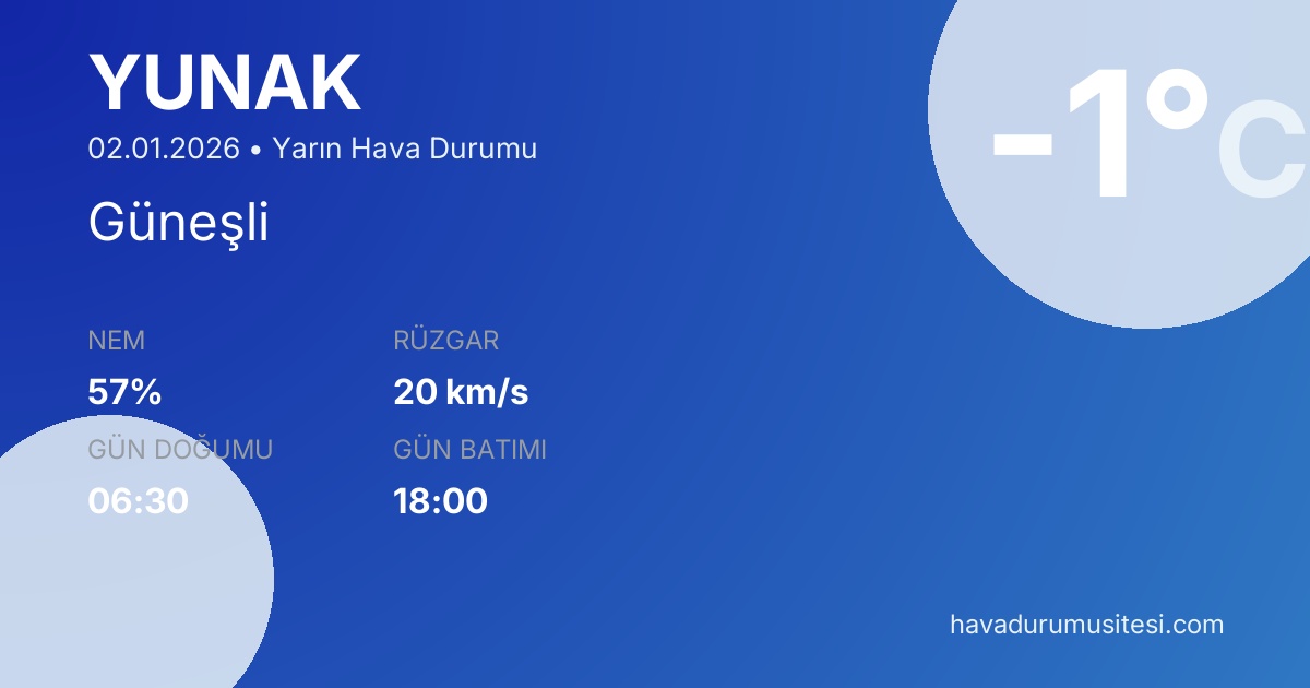 Yarın Yunak ilçesinde sabah saatlerinde minimum -6°C civarında başlayacak sıcaklıklar, öğle ve öğleden sonra saatlerinde maksimum 5°C seviyesine ulaşacaktır. Genel hava durumu Güneşli olarak tahmin edilmektedir. Yağış beklenmemektedir, açık hava aktiviteleri için uygun bir gün olacaktır. Daha detaylı saat saat bilgi için Yunak saatlik hava durumu sayfamızı inceleyebilirsiniz. Ayrıca 5 günlük, 15 günlük ve 30 günlük tahminler ile uzun vadeli planlamalarınızı yapabilirsiniz.