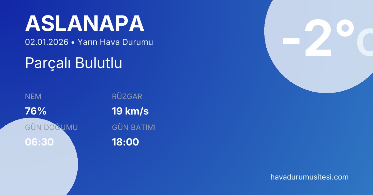 Daha detaylı saat saat bilgi için Aslanapa saatlik hava durumu sayfamızı inceleyebilirsiniz.
