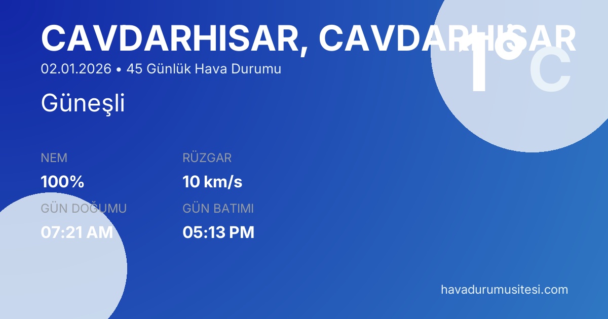 Çavdarhi̇sar için 45 günlük detaylı hava durumu tahmini. Son güncelleme: 02.01.2026 15:43 | Veriler uluslararası meteoroloji standartlarına uygun olarak işlenmektedir.