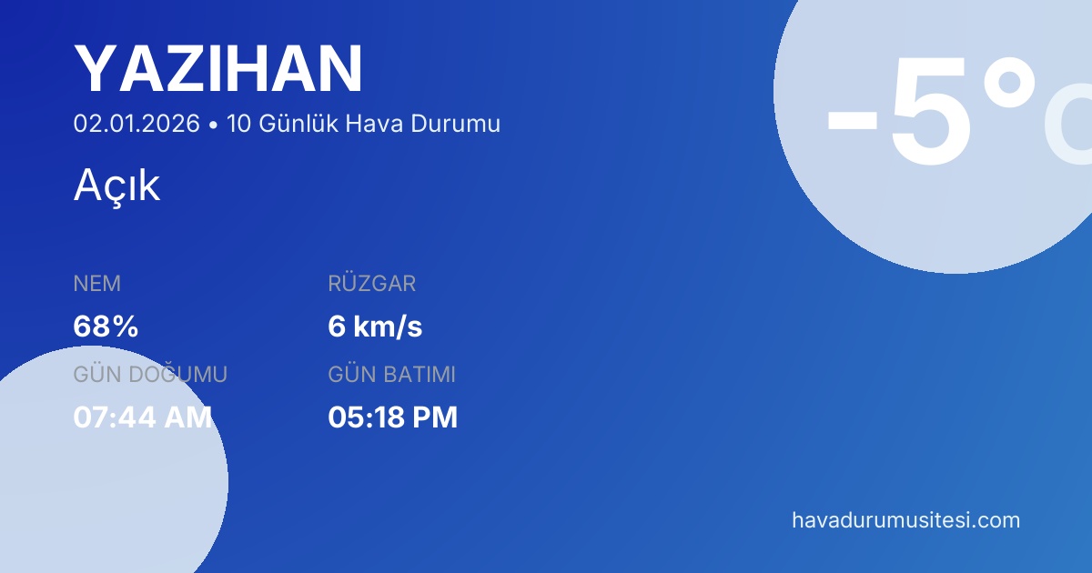 Yazihan için 10 günlük detaylı hava durumu tahmini. Son güncelleme: 02.01.2026 19:01 | Veriler uluslararası meteoroloji standartlarına uygun olarak işlenmektedir.