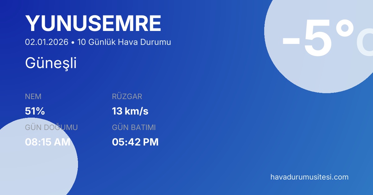 Yunusemre için 10 günlük detaylı hava durumu tahmini. Son güncelleme: 02.01.2026 15:35 | Veriler uluslararası meteoroloji standartlarına uygun olarak işlenmektedir.