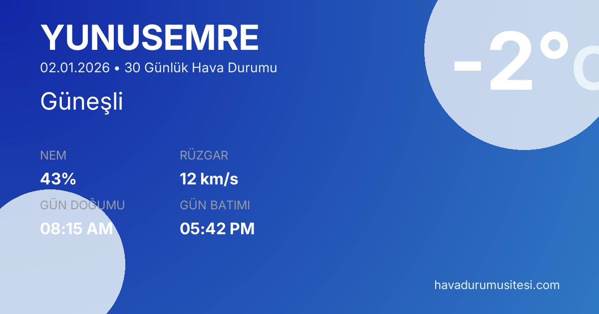 Yunusemre için 30 günlük detaylı hava durumu tahmini. Son güncelleme: 02.01.2026 17:30 | Veriler uluslararası meteoroloji standartlarına uygun olarak işlenmektedir.