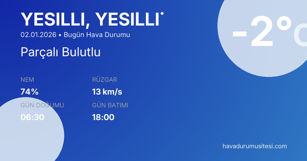 Yeşi̇lli̇ bugün hava durumu tahminleri düzenli olarak güncellenmektedir. 7 günlük haftalık tahmin ve 30 günlük uzun vadeli tahmin sayfalarımız ile farklı zaman dilimleri için planlama yapabilirsiniz. Meteoroloji verileri güvenilir kaynaklardan alınmakta ve sürekli güncellenmektedir. Son güncelleme: 02.01.2026 07:50