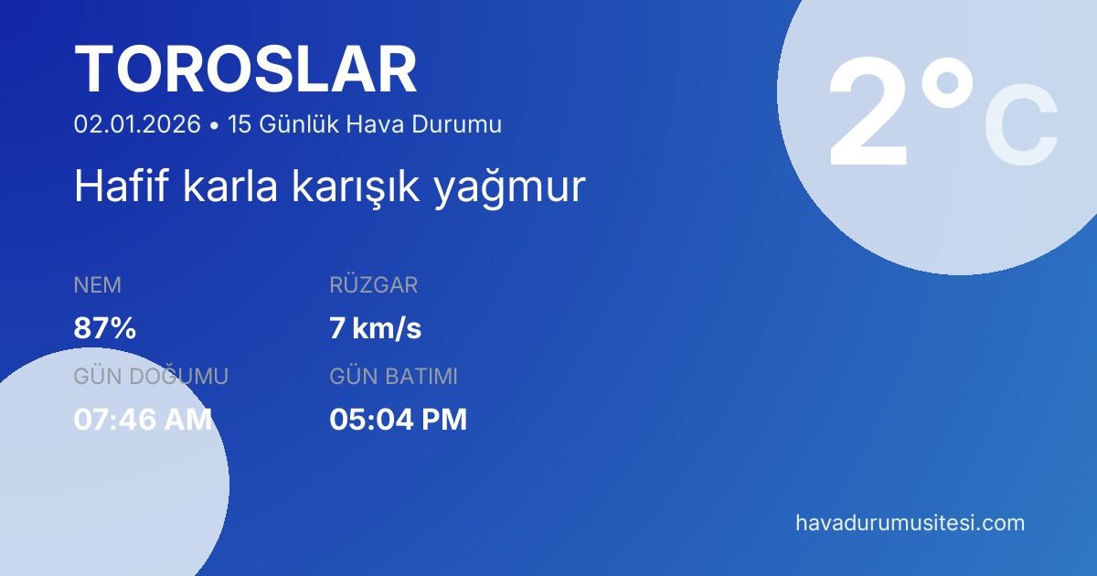 Toroslar 15 günlük hava durumu tahminleri düzenli olarak güncellenmektedir. Meteoroloji verileri güvenilir kaynaklardan alınmakta ve sürekli güncellenmektedir. Son güncelleme: 02.01.2026 09:14