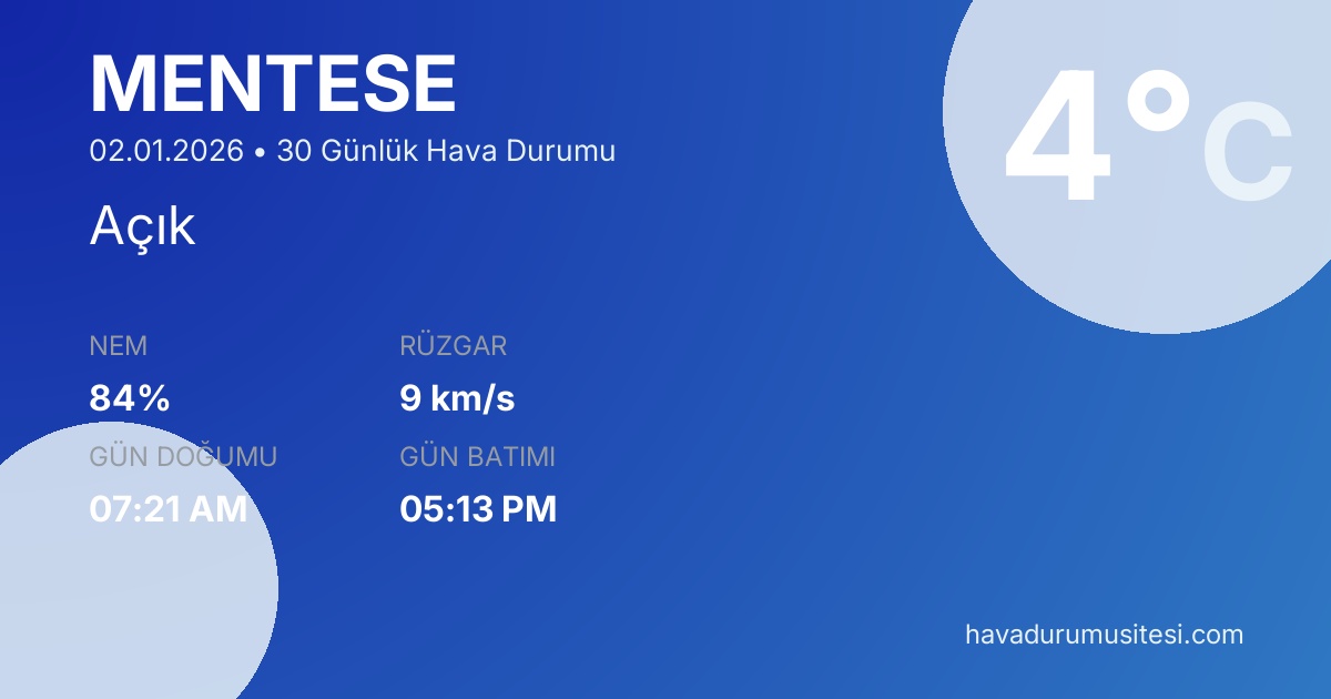 Önümüzdeki 30 gün boyunca sıcaklıkların -4°C ile 14°C arasında seyretmesi beklenmektedir. 13 gün yağışlı geçecek. 10 gün güneşli hava beklenmektedir. Menteşe hava durumu tahminleri düzenli olarak güncellenmektedir. Meteoroloji verileri güvenilir kaynaklardan alınmakta ve sürekli güncellenmektedir. Son güncelleme: 02.01.2026 09:55