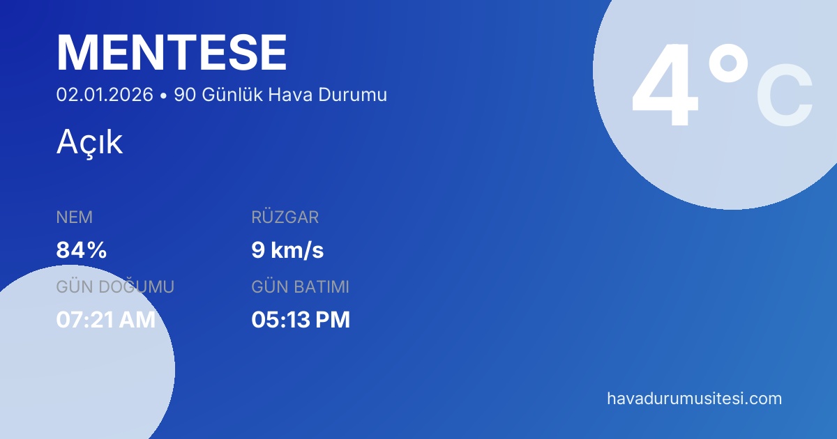 Önümüzdeki 90 gün boyunca sıcaklıkların -4°C ile 17°C arasında seyretmesi beklenmektedir. 28 gün yağışlı geçecek. 29 gün güneşli hava beklenmektedir. Menteşe hava durumu tahminleri düzenli olarak güncellenmektedir. Meteoroloji verileri güvenilir kaynaklardan alınmakta ve sürekli güncellenmektedir. Son güncelleme: 02.01.2026 09:56