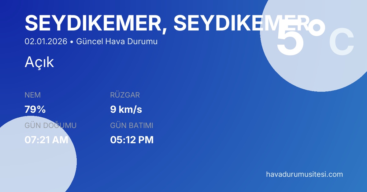Seydi̇kemer ilçesi için hava durumu tahminleri düzenli olarak güncellenmektedir. Saatlik hava durumu takibi ile gün içi planlamalarınızı yapabilirsiniz. 30 günlük uzun vadeli tahminler ile aylık planlamalarınızı yapabilirsiniz. Ayrıca 7 günlük ve 10 günlük tahminler ile haftalık planlamalarınızı yapabilirsiniz. Meteoroloji verileri güvenilir kaynaklardan alınmakta ve sürekli güncellenmektedir. Son güncelleme: 02.01.2026 07:20