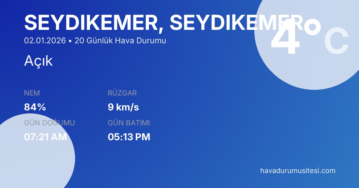Seydi̇kemer için 20 günlük hava durumu tahminleri. Şu anda sıcaklık 4°C ve hava durumu Açık. Hissedilen sıcaklık 2°C. Nem oranı %84. Rüzgar hızı 9 km/s. Seydi̇kemer için güncel meteoroloji bilgileri, bugünkü hava durumu, yarınki tahmin ve 48 saatlik saatlik analiz sayfalarımızda detaylı bilgiler bulunmaktadır.