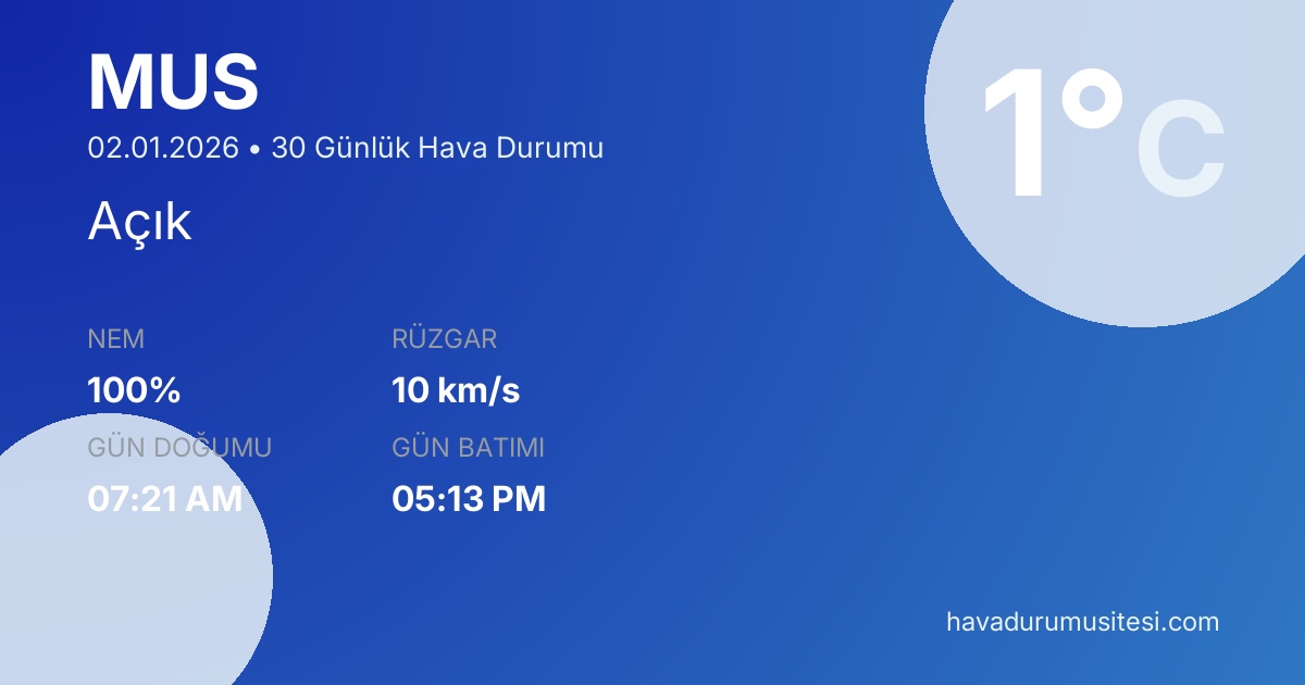 Muş için 30 günlük detaylı hava durumu tahmini. Son güncelleme: 02.01.2026 13:38 | Veriler uluslararası meteoroloji standartlarına uygun olarak işlenmektedir.