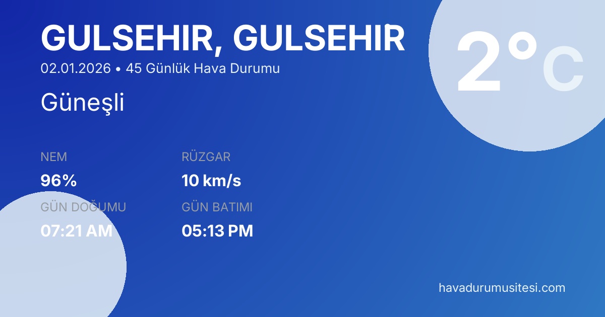 Gülşehi̇r için 45 günlük detaylı hava durumu tahmini. Son güncelleme: 02.01.2026 17:20 | Veriler uluslararası meteoroloji standartlarına uygun olarak işlenmektedir.