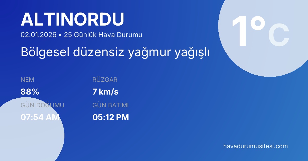 Altinordu için 25 günlük detaylı hava durumu tahmini. Son güncelleme: 02.01.2026 10:14 | Veriler uluslararası meteoroloji standartlarına uygun olarak işlenmektedir.