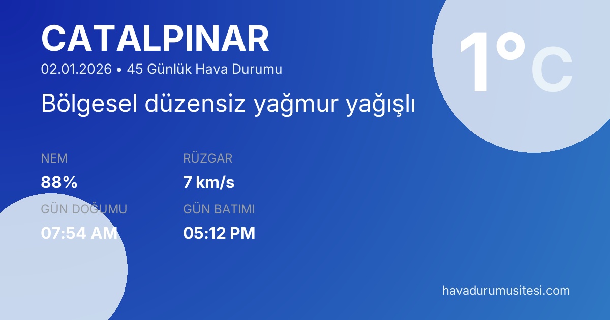 Çatalpinar için 45 günlük detaylı hava durumu tahmini. Son güncelleme: 02.01.2026 10:13 | Veriler uluslararası meteoroloji standartlarına uygun olarak işlenmektedir.