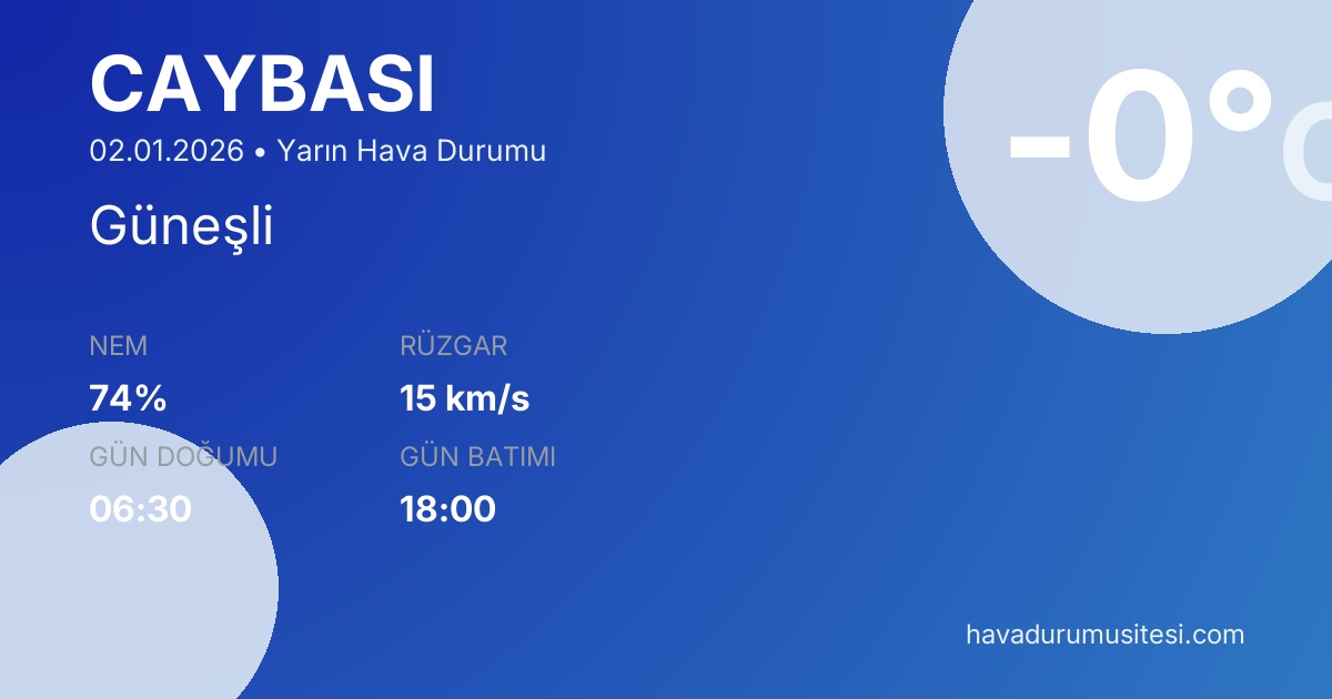Yarın Çaybaşi ilçesinde sabah saatlerinde minimum -5°C civarında başlayacak sıcaklıklar, öğle ve öğleden sonra saatlerinde maksimum 5°C seviyesine ulaşacaktır. Genel hava durumu Güneşli olarak tahmin edilmektedir. Yağış beklenmemektedir, açık hava aktiviteleri için uygun bir gün olacaktır. Daha detaylı saat saat bilgi için Çaybaşi saatlik hava durumu sayfamızı inceleyebilirsiniz. Ayrıca 5 günlük, 15 günlük ve 30 günlük tahminler ile uzun vadeli planlamalarınızı yapabilirsiniz.