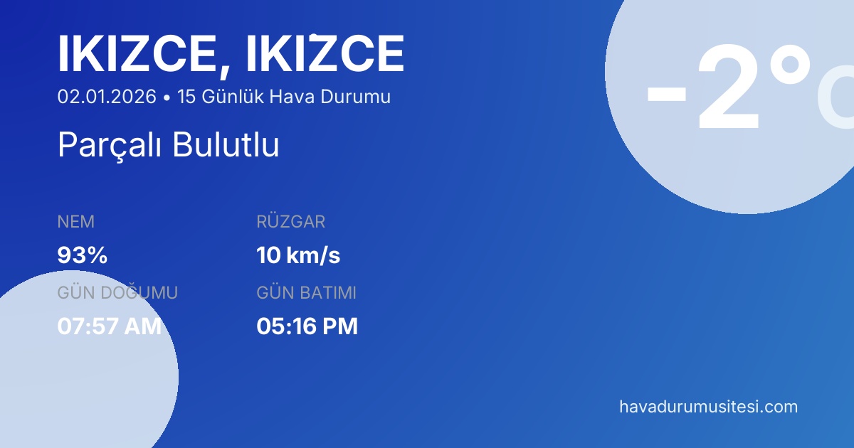 15 günlük hava durumu tahminleri, iki haftalık dönem için en detaylı meteoroloji bilgilerini sunmaktadır. Tatil planlaması, tarım faaliyetleri, inşaat işleri ve açık hava etkinlikleri için ideal bir planlama aracıdır. Günlük tahminler için İki̇zce bugünkü meteoroloji, kısa vadeli planlamalar için yarınki hava durumu tahmini ve detaylı saatlik bilgiler için 48 saatlik saatlik analiz sayfalarımızı ziyaret edebilirsiniz. Ayrıca 5 günlük, 7 günlük ve 10 günlük hava durumu tahminleri ile haftalık planlamalarınızı yapabilirsiniz.