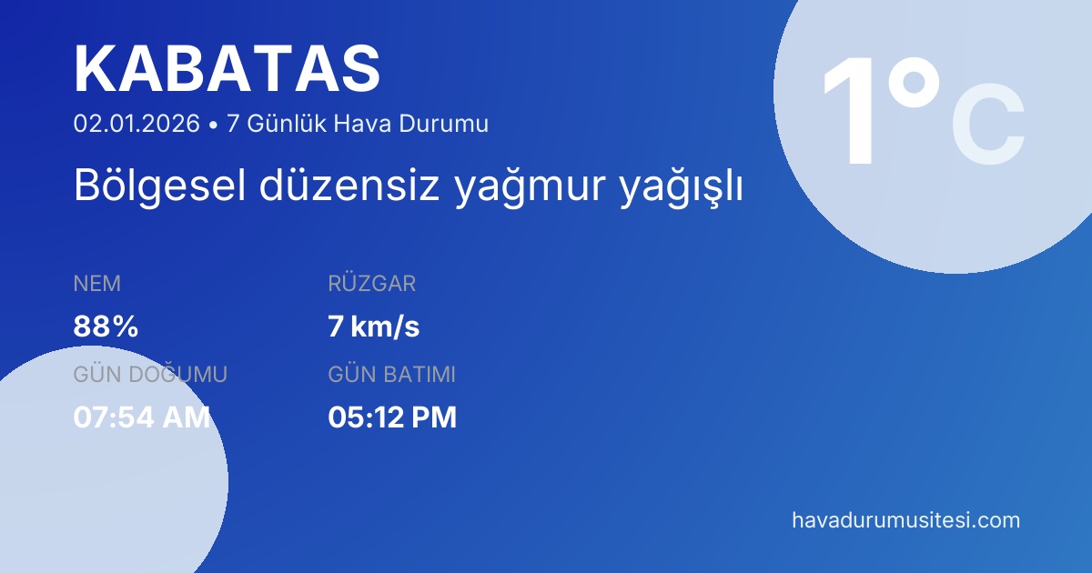 Kabataş için 7 günlük detaylı hava durumu tahmini. Son güncelleme: 02.01.2026 10:06 | Veriler uluslararası meteoroloji standartlarına uygun olarak işlenmektedir.