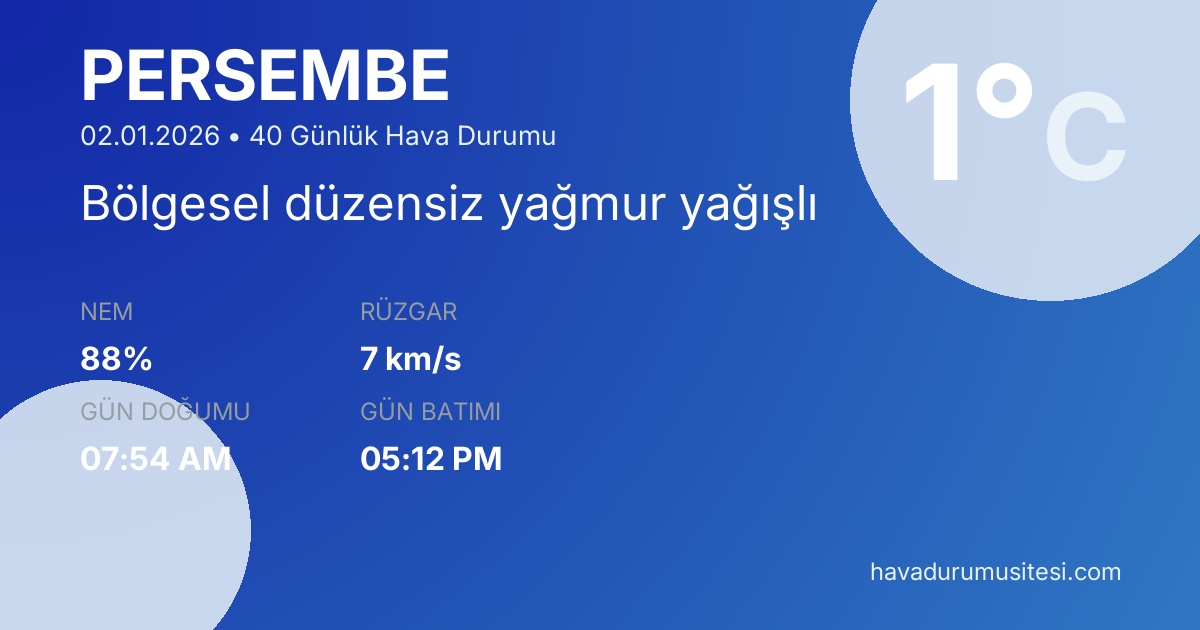 Önümüzdeki 40 gün boyunca sıcaklıkların -2°C ile 17°C arasında seyretmesi beklenmektedir. 12 gün yağışlı geçecek. 7 gün güneşli hava beklenmektedir. Perşembe hava durumu tahminleri düzenli olarak güncellenmektedir. Meteoroloji verileri güvenilir kaynaklardan alınmakta ve sürekli güncellenmektedir. Son güncelleme: 02.01.2026 09:56