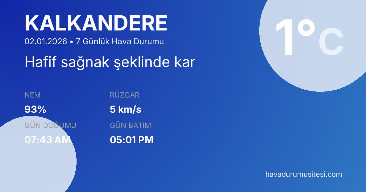 Kalkandere için 7 günlük detaylı hava durumu tahmini. Son güncelleme: 02.01.2026 11:58 | Veriler uluslararası meteoroloji standartlarına uygun olarak işlenmektedir.