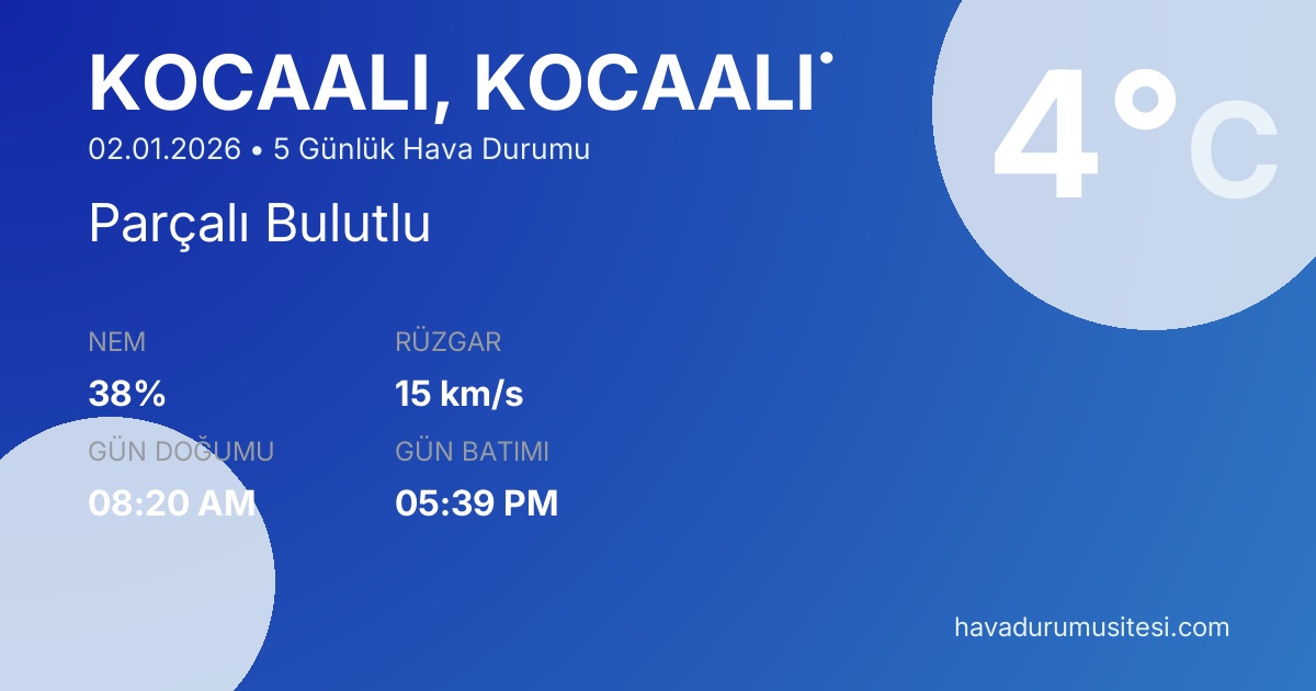 Kocaali̇ için 5 günlük hava durumu tahminleri. Şu anda sıcaklık 4°C ve hava durumu Parçalı Bulutlu. Hissedilen sıcaklık 1°C. Nem oranı %38. Rüzgar hızı 15 km/s. Kocaali̇ için güncel meteoroloji bilgileri, bugünkü hava durumu, yarınki tahmin ve 48 saatlik saatlik analiz sayfalarımızda detaylı bilgiler bulunmaktadır.