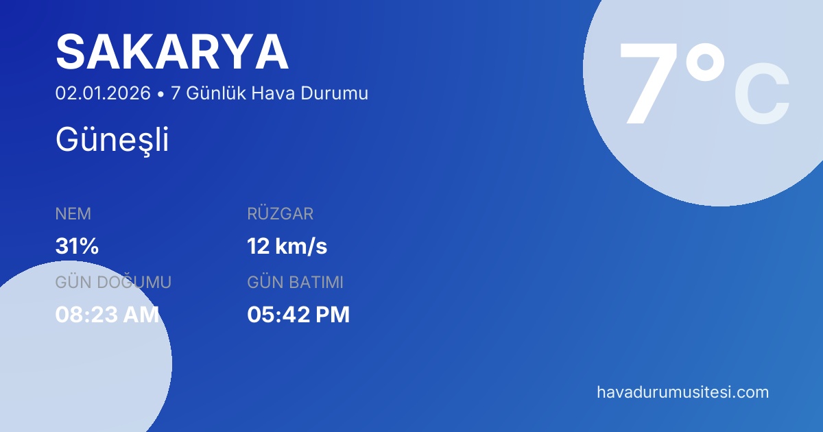 Sakarya için 7 günlük detaylı hava durumu tahmini. Son güncelleme: 02.01.2026 09:55 | Veriler uluslararası meteoroloji standartlarına uygun olarak işlenmektedir.