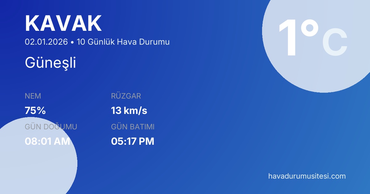 Önümüzdeki 10 gün boyunca sıcaklıkların -13°C ile 12°C arasında seyretmesi beklenmektedir. 5 gün güneşli hava beklenmektedir. Kavak hava durumu tahminleri düzenli olarak güncellenmektedir. Meteoroloji verileri güvenilir kaynaklardan alınmakta ve sürekli güncellenmektedir. Son güncelleme: 02.01.2026 15:33