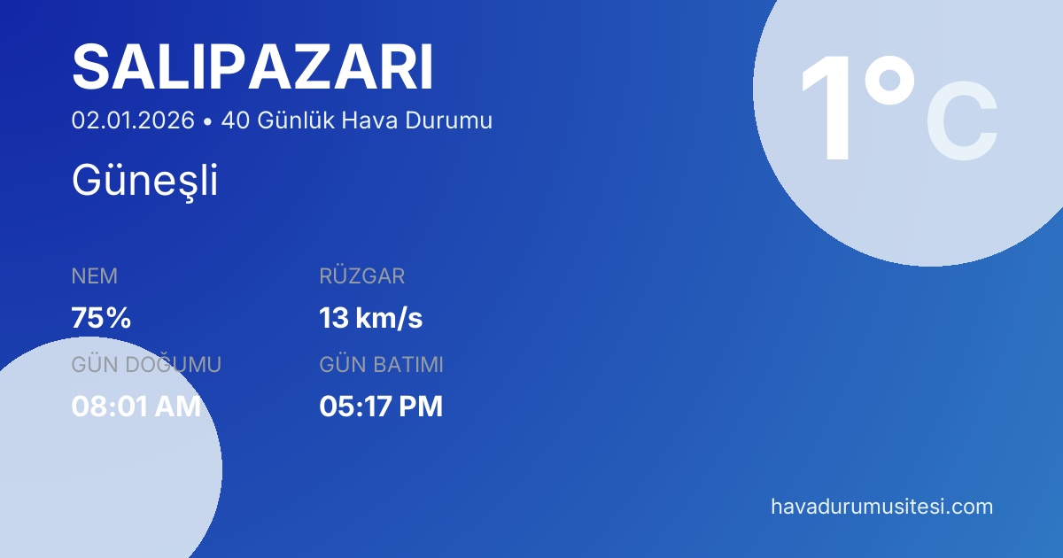 Salipazari için 40 günlük detaylı hava durumu tahmini. Son güncelleme: 02.01.2026 12:11 | Veriler uluslararası meteoroloji standartlarına uygun olarak işlenmektedir.