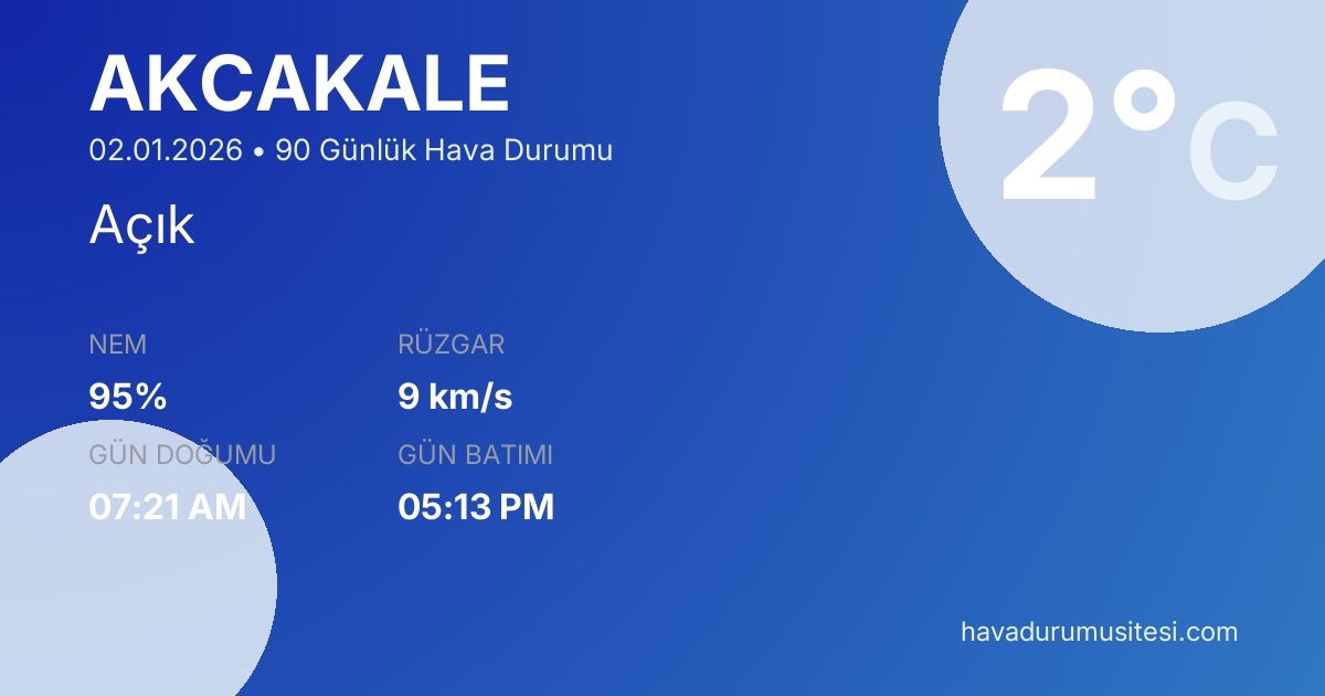 Akçakale için 90 günlük detaylı hava durumu tahmini. Son güncelleme: 02.01.2026 10:06 | Veriler uluslararası meteoroloji standartlarına uygun olarak işlenmektedir.