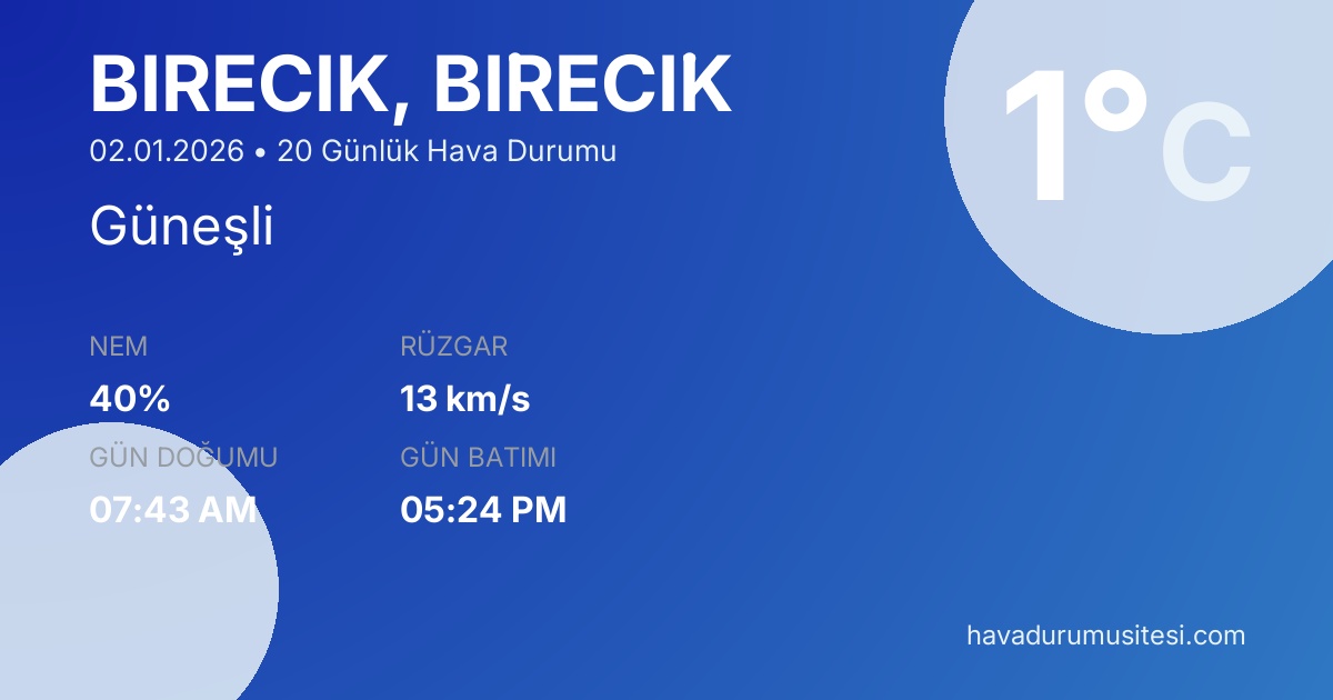 Bi̇reci̇k için 20 günlük detaylı hava durumu tahmini. Son güncelleme: 02.01.2026 13:51 | Veriler uluslararası meteoroloji standartlarına uygun olarak işlenmektedir.