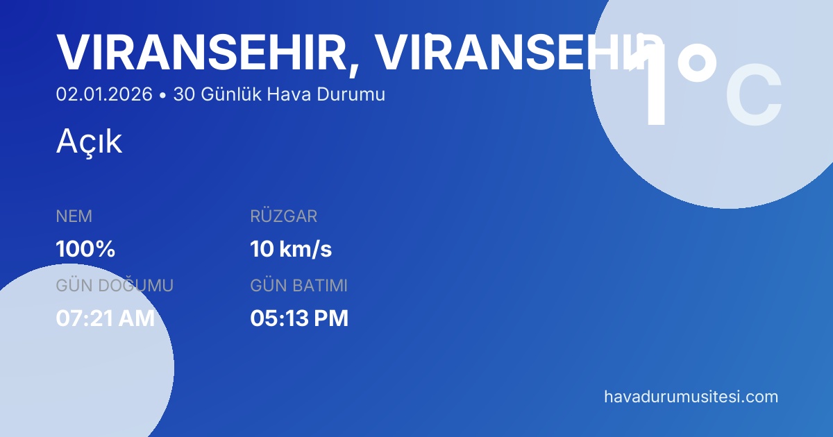 Vi̇ranşehi̇r için 30 günlük detaylı hava durumu tahmini. Son güncelleme: 02.01.2026 15:32 | Veriler uluslararası meteoroloji standartlarına uygun olarak işlenmektedir.