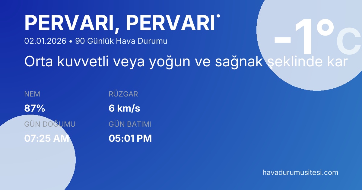 Pervari̇ için 90 günlük detaylı hava durumu tahmini. Son güncelleme: 02.01.2026 09:54 | Veriler uluslararası meteoroloji standartlarına uygun olarak işlenmektedir.