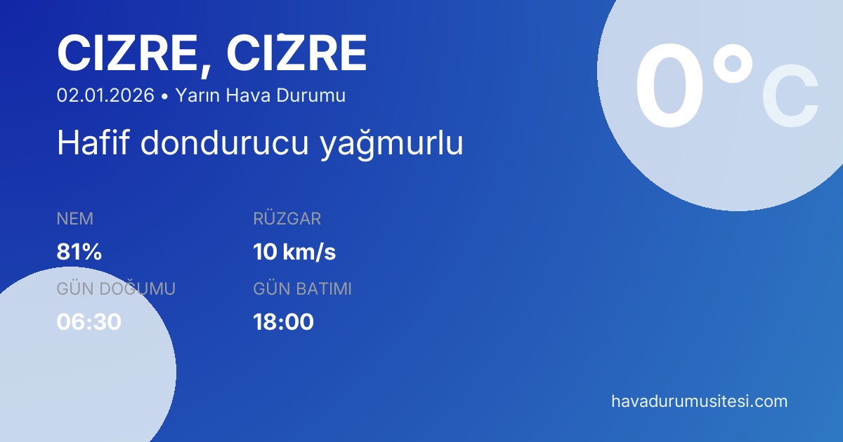 Ci̇zre yarın hava durumu tahminleri düzenli olarak güncellenmektedir. Meteoroloji verileri güvenilir kaynaklardan alınmakta ve sürekli güncellenmektedir. Son güncelleme: 02.01.2026 10:03