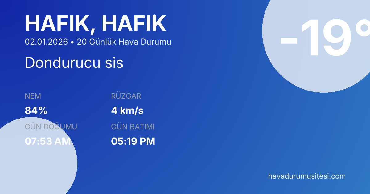 Hafi̇k için 20 günlük hava durumu tahminleri. Şu anda sıcaklık -19°C ve hava durumu Dondurucu sis. Hissedilen sıcaklık -23°C. Nem oranı %84. Rüzgar hızı 4 km/s. Hafi̇k için güncel meteoroloji bilgileri, bugünkü hava durumu, yarınki tahmin ve 48 saatlik saatlik analiz sayfalarımızda detaylı bilgiler bulunmaktadır.