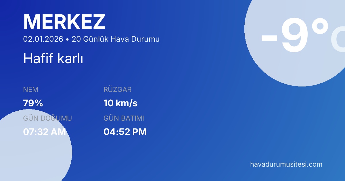 Önümüzdeki 20 gün boyunca sıcaklıkların -18°C ile 3°C arasında seyretmesi beklenmektedir. 13 gün yağışlı geçecek. 3 gün güneşli hava beklenmektedir. Merkez hava durumu tahminleri düzenli olarak güncellenmektedir. Meteoroloji verileri güvenilir kaynaklardan alınmakta ve sürekli güncellenmektedir. Son güncelleme: 02.01.2026 07:51