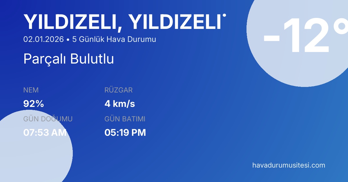 Önümüzdeki 5 gün boyunca sıcaklıkların -19°C ile 4°C arasında seyretmesi beklenmektedir. 1 gün güneşli hava beklenmektedir. Yildizeli̇ hava durumu tahminleri düzenli olarak güncellenmektedir. Meteoroloji verileri güvenilir kaynaklardan alınmakta ve sürekli güncellenmektedir. Son güncelleme: 02.01.2026 07:54