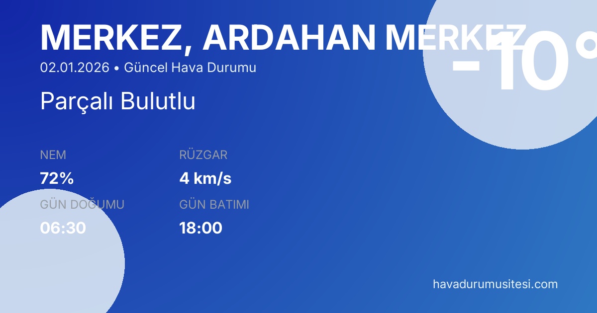 Ardahan Merkez için güncel ardahan merkez hava durumu 15 günlük bilgileri. Meteoroloji verileri ile detaylı hava durumu tahminleri, sıcaklık, yağış, rüzgar ve nem bilgileri. MGM ve yandex hava durumu verileri ile güncel tahminler.