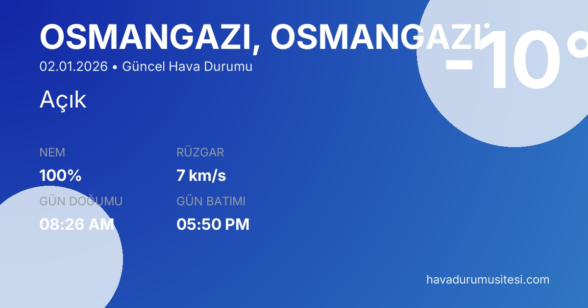Osmangazi̇ için güncel osmangazi̇ yarınki hava durumu bilgileri. Meteoroloji verileri ile detaylı hava durumu tahminleri, sıcaklık, yağış, rüzgar ve nem bilgileri. MGM ve yandex hava durumu verileri ile güncel tahminler.