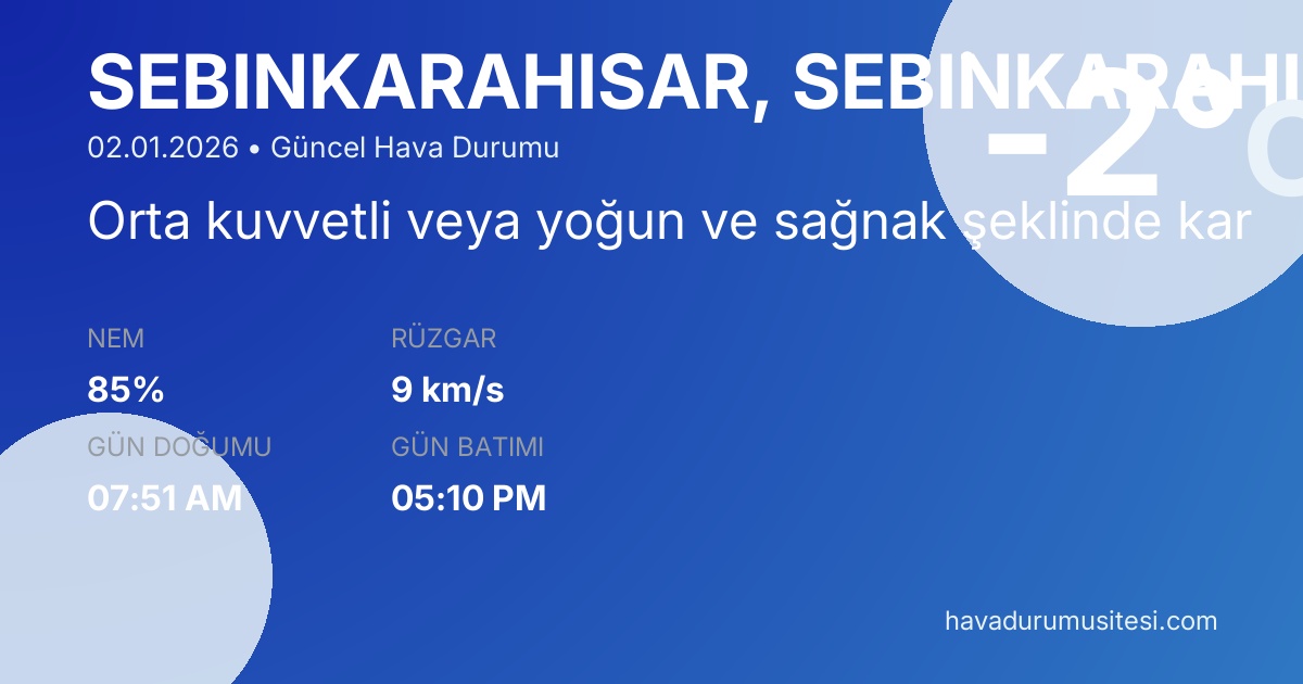 Şebi̇nkarahi̇sar bölgesi için güncel hava durumu tahminleri, meteoroloji verileri ve detaylı hava durumu raporları. Sıcaklık değerleri, yağış olasılıkları, rüzgar hızı ve yönü, nem oranı ve görüş mesafesi bilgileri ile günlük planlarınızı yapabilirsiniz. MGM ve yandex hava durumu verileri ile güncel meteoroloji bilgilerine erişebilirsiniz.